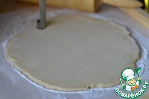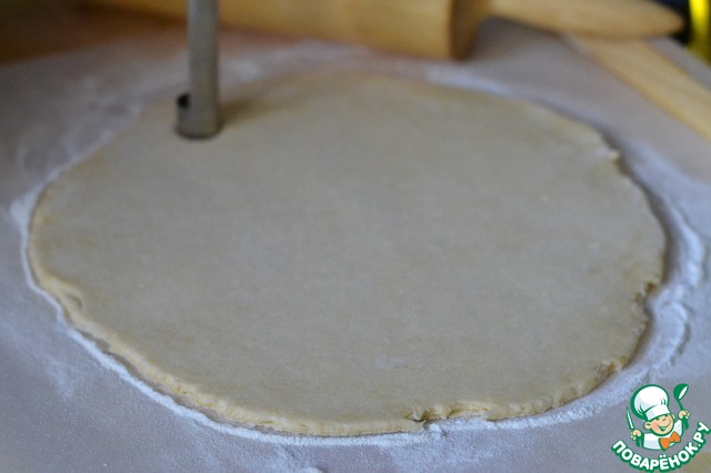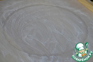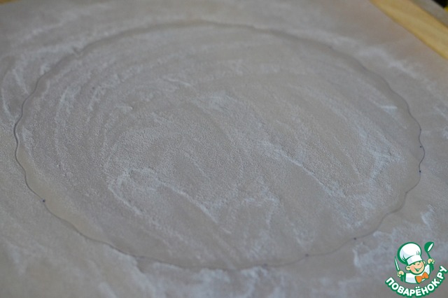 На разделочную доску выкладываем бумагу для выпечки, присыпать хорошо мукой.