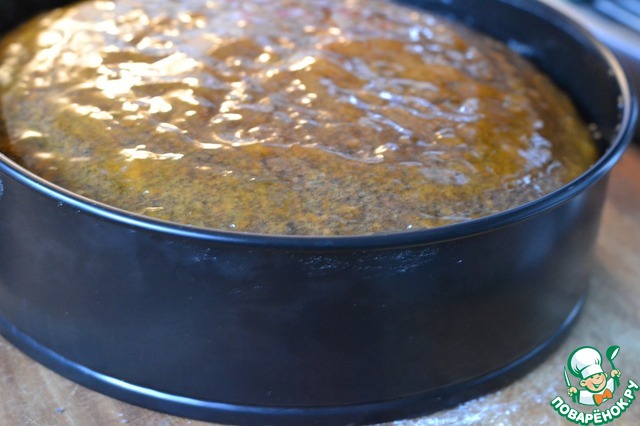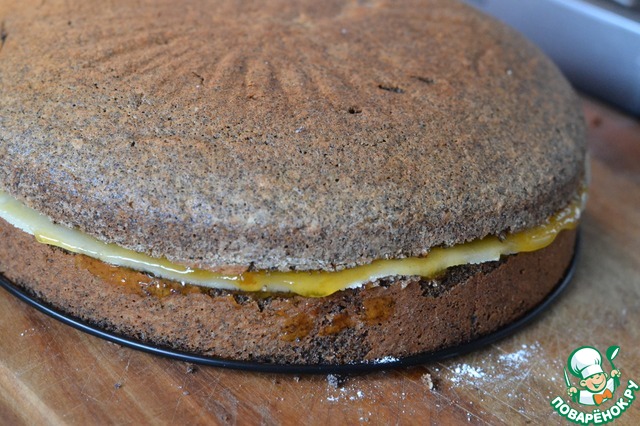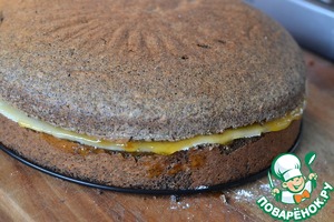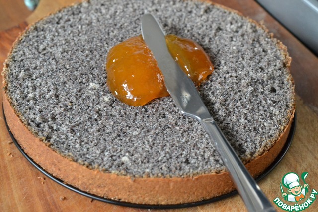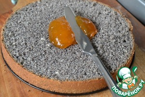 Нанести на нижнюю часть торта 3ст. ложки абрикосового джема. Разровнять ножом.