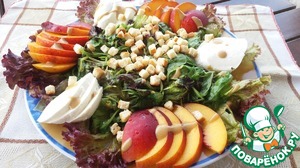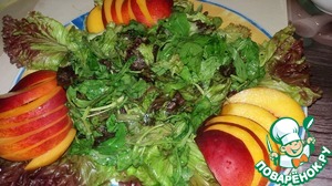 • Выкладываем салат на блюдо, нарезаем нектарин и моцареллу дольками, выкладываем сверху салата согласно вашей фантазии.
