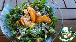 В салатник поместить зелень, персик и сыр, посолить, поперчить, перемешать. Залить соусом и посыпать кунжутом.