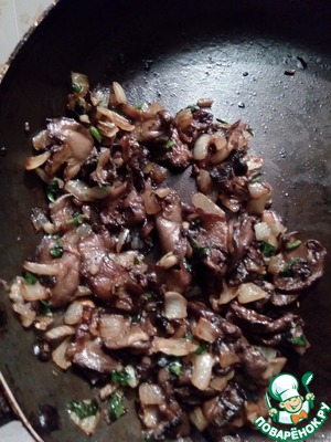 На растительном масле обжариваем лук, чеснок и порезанные грибы.