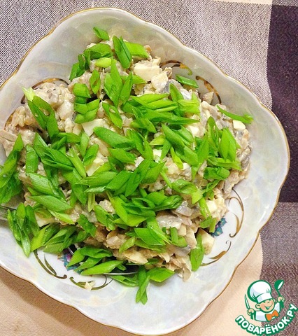 Продукты смешиваем, вводим сметану, тщательно перемешиваем. При подаче посыпать мелко рубленной зеленью лука.
