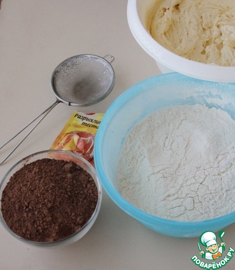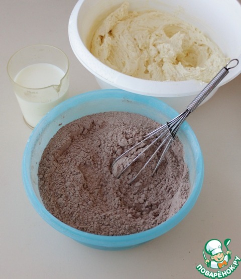 Хорошо размешать просеянную муку с какао и разрыхлителем или же просеять всё вместе, соединить все компоненты, добавить молоко.