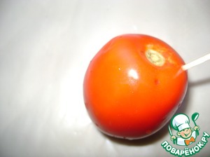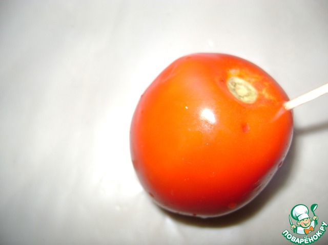 У помидоров делаем зубочисткой несколько проколов. Это нужно, чтобы уменьшить количество треснутых помидор при стерилизации.
