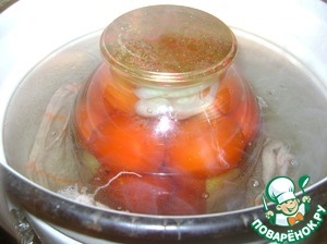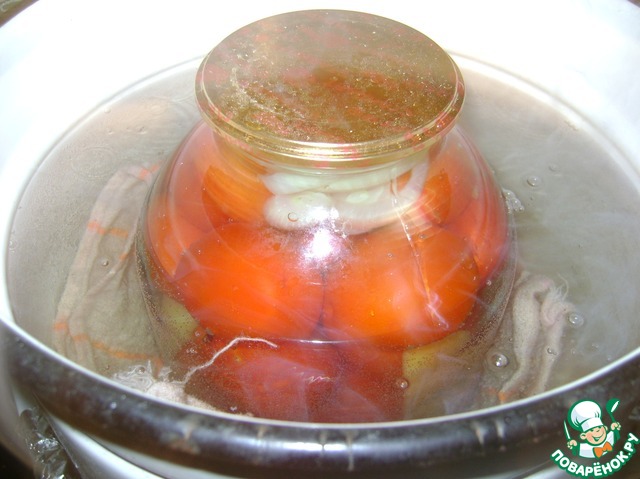 Не очень горячим заливаем помидоры и стерилизуем 12-15 минут.