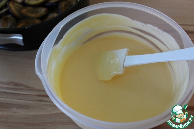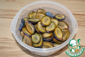 За это время подготовить фрукты. У меня слива. Нарезать шайбочками или дольками или кусочками, я оставила половинки.