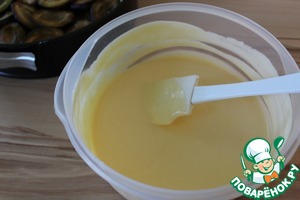 Для заливки смешать крем фреш, 2 ст. л сахара, ванильный сахар и 3 яйца.