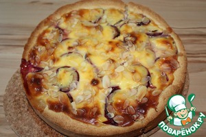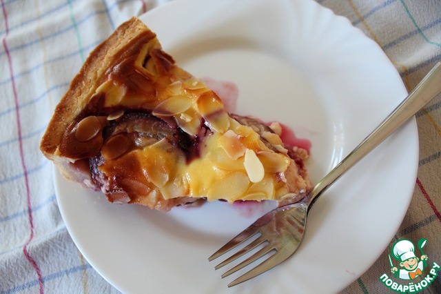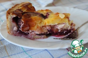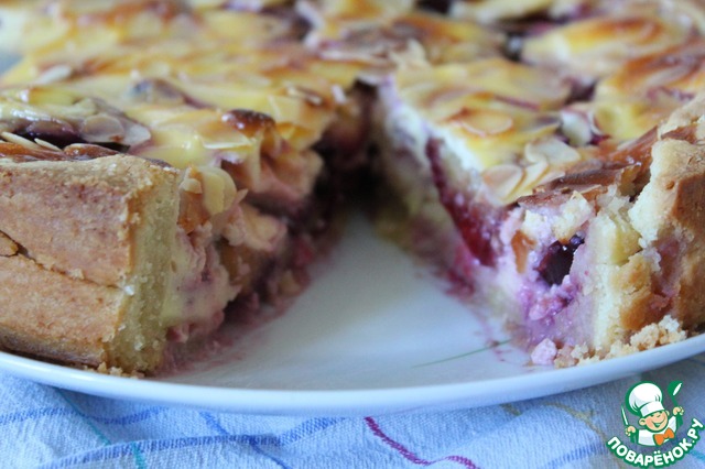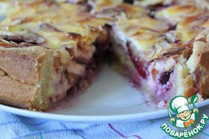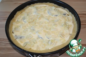 Залить пирог заливкой. И посыпать миндальными лепестками или другими орехами. Выпекать 50 -60 минут в разогретой до 175 °С духовке. Достать пирог и оставить в форме ещё 15 минут. Затем аккуратно освободить пирог от формы и оставить до полного остывания.