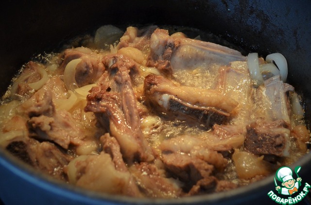 На растительном масле обжарить ребра, до румяности, минут 10-12.