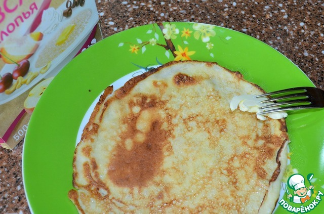 • Горячим смазать блинчик сливочным маслом.
