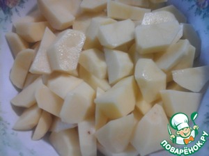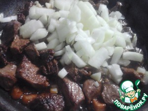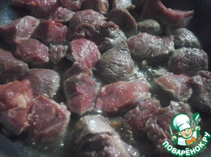 Говядину нарезать средними кусочками (примерно 1,5 * 2 см) и добавить к бекону.