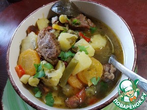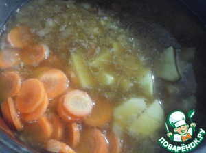 По истечении времени мясо в пиве перекладываем в кастрюлю, добавляем в нее говяжий бульон, картофель и морковь.
