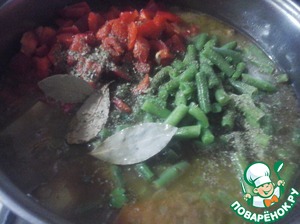 Затем добавить нарезанный кубиками болгарский перец, стручковую фасоль, лавровый лист, майоран.