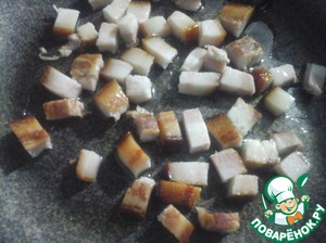 Бекон нарезать мелкими кубиками и обжарить в оливковом масле на сильном огне.
