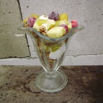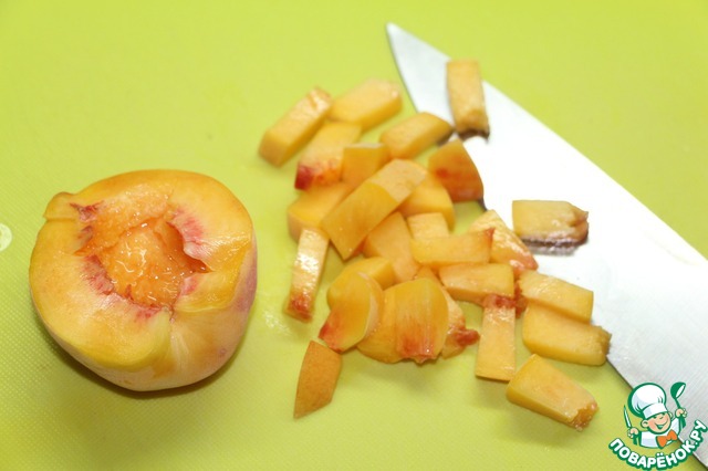 Порезать персик (абрикос, яблоко, грушу или не порезать ягоды) кубиками. Любые ягоды фрукты по сезону.