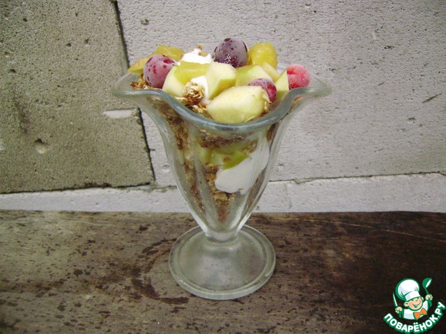 В мисочку (чашку, креманку) положить мюсли, затем ложку йогурта