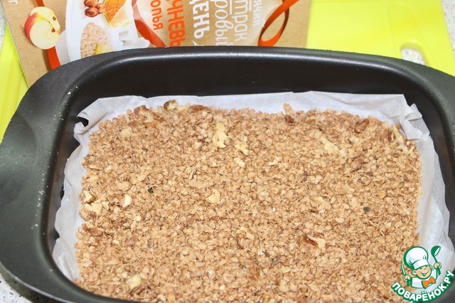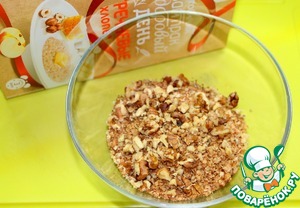 Мелко порубить грецкие орехи (орехи могут быть любыми). Смешать орехи с хлопьями.