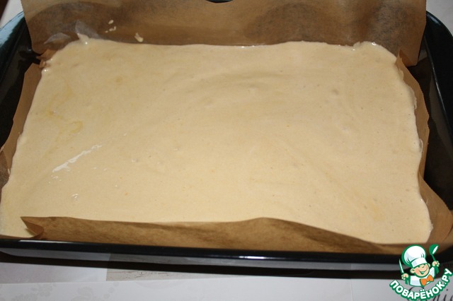 Форму (24 х 34 см) смазать сливочным маслом или застелить бумагой для выпечки. Вылить тесто, распределить лопаткой.