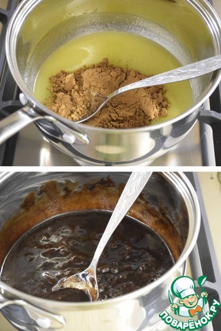 Добавим какао-порошок, постоянно помешивая доведем смесь до кипения и проварим пару минут. Смотрите, чтобы смесь не подгорела! Даем остыть шоколадной основе до комнатной температуры.