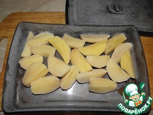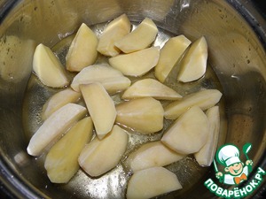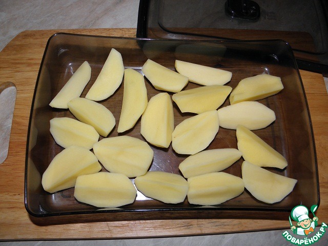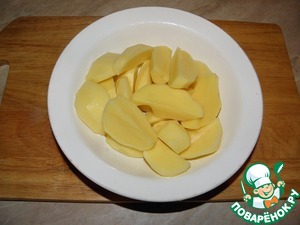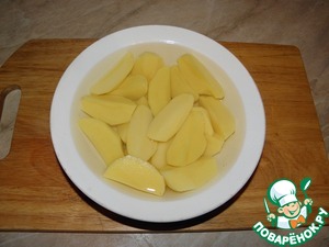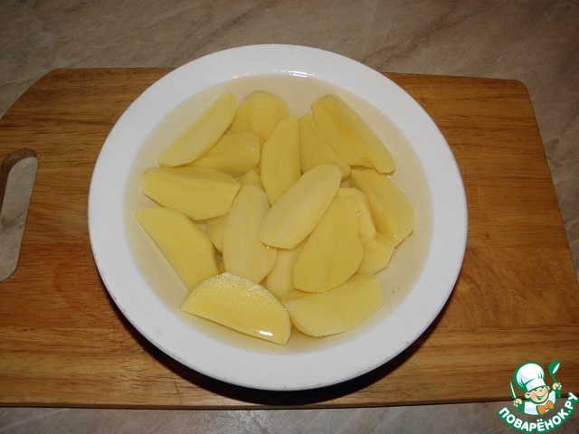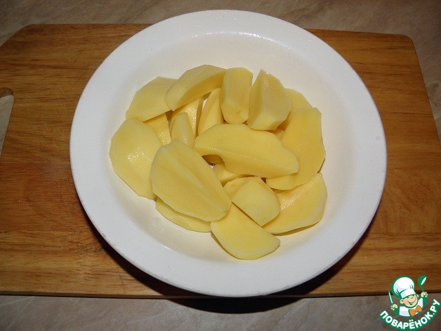 Картофель чистим (если совсем молодой, то кожуру оставляем), режем на четыре части (если картофель очень крупный, то каждую дольку еще на две части), у нас должны получится именно дольки (мельчить не стоит)