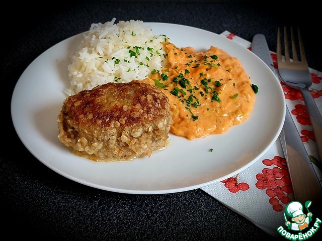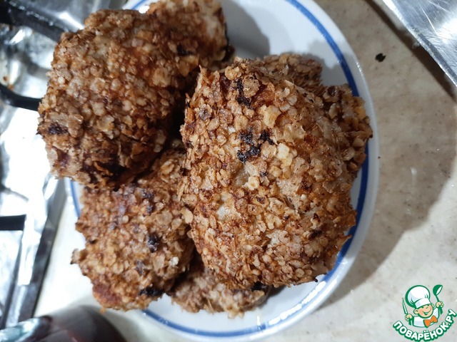 Можно, конечно, панировать в обычных сухарях, но я предпочитаю их смешивать с овсяными хлопьями 1:1.