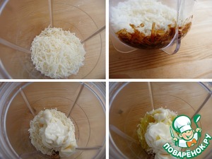 Для соуса-заправки смешать сыр (пармезан натереть на мелкой терке), соевый соус, майонез, оливковое масло. Взбить.