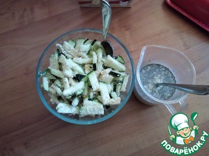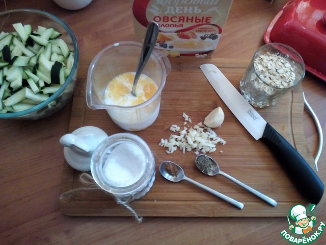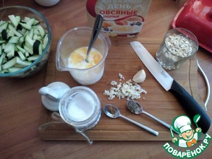 В посуду с цуккини выкладываем хлопья, чеснок. Всё перемешиваем и заливаем сливочно-яичной смесью. Даём постоять минут 5, чтобы хлопья разбухли.