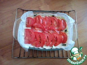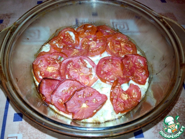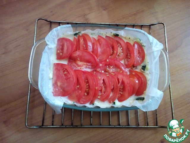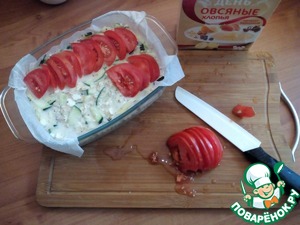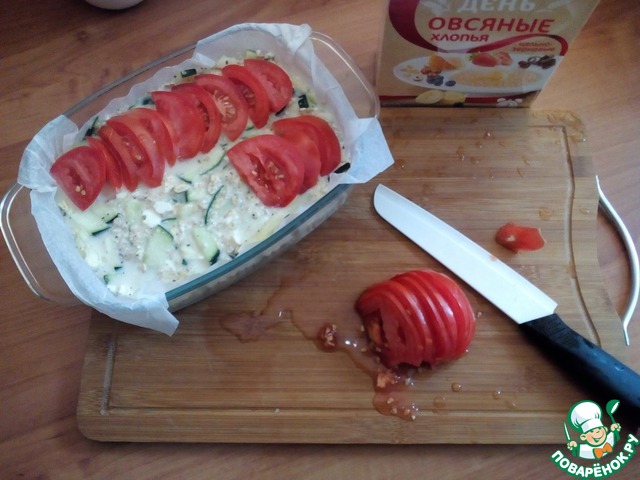 Выкладываем в форму яично-сливочную смесь с овощами и овсянкой, разравнивая по форме. Помидор тонко режем и укладываем сверху будущей запеканки.