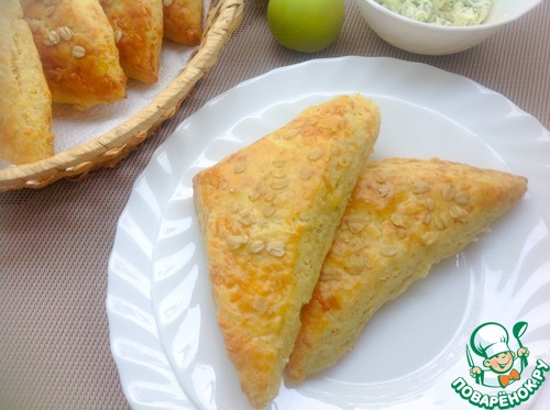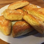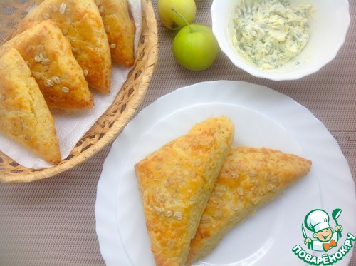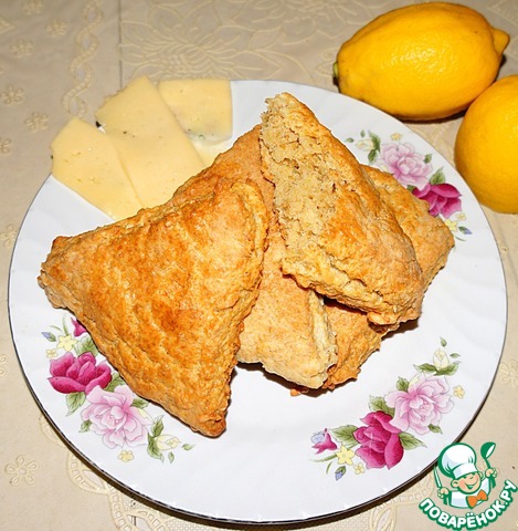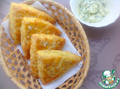 Сконы – это быстрые булочки, родом из Англии. Поднимаются они за счет разрыхлителя или соды, поэтому пекут сконы с сыром обычно немного и прямо к приёму пищи, очень часто к завтраку. Готовятся сконы быстро, всего за полчаса, 10 минут из которых уходит на замес теста и разогрев духовки, а 20 минут они пекутся. Я предлагаю подать на завтрак тёплые сырные сконы с луковым маслом. Это очень вкусно и сытно! Угощайтесь!