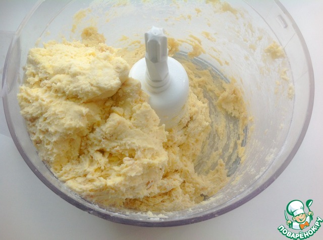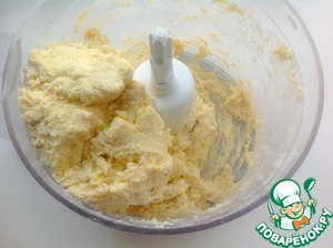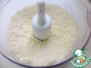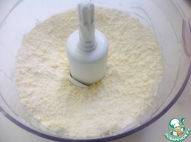 В блендер добавить муку, разрыхлитель и соль, перемешать. Добавить замороженное и нарезанное кубиками сливочное масло, порубить муку с маслом до размера горошины.