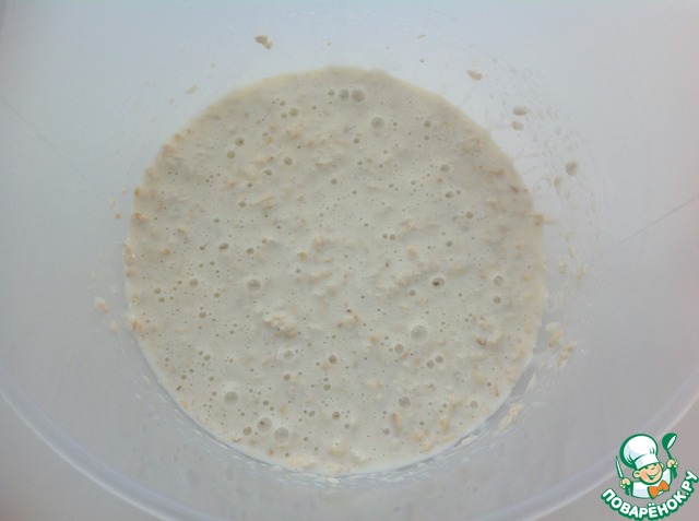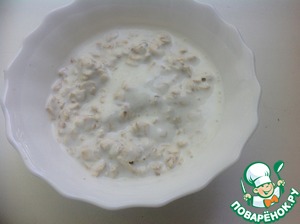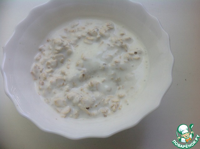 Овсяные хлопья залить тёплым кефиром и дать постоять 10 минут. У меня овсяные хлопья цельнозерновые ТМ Мистраль.