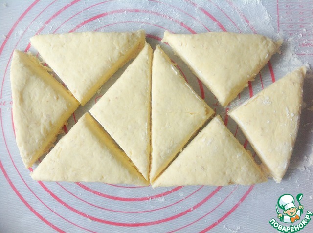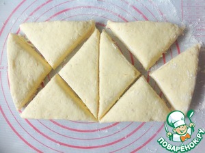 Раскатать тесто в прямоугольник размером 12 х 24 см. Окунуть острый нож в муку, затем разрезать тесто на восемь треугольников.