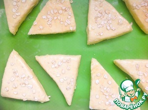 Желток размешать с водой. Смазать каждую лепешку яйцом, сверху присыпать овсяными хлопьями.