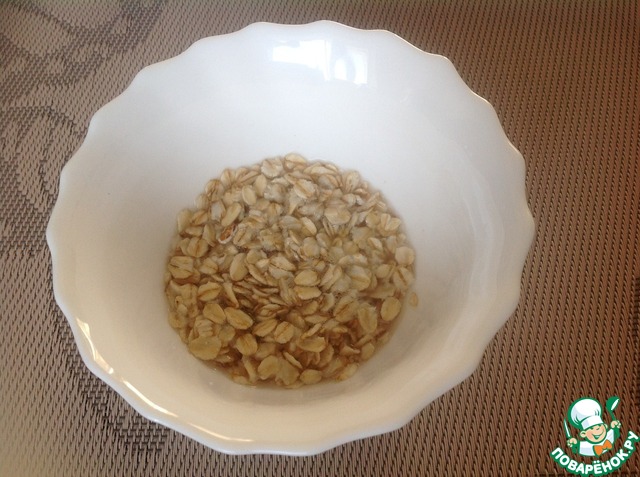 Овсяные хлопья насыпать в миску, залить тёплой водой и дать набухнуть 5 минут.