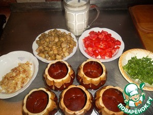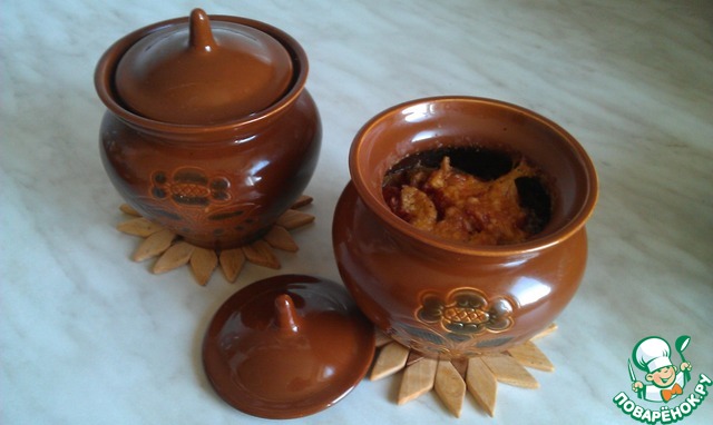 Извлекаем горшочки из духовки, в каждый отправляем по 3-4 щепотки натертого на мелкой терке сыра, выключаем духовку и ставим горшочки в уже выключенную духовку минут на 10-15…