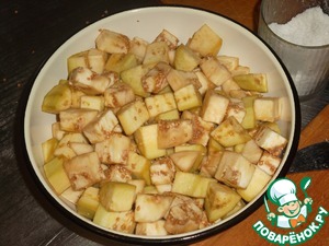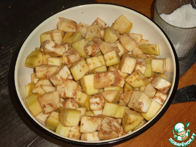 Баклажаны очистим и нарежем средними кубиками.