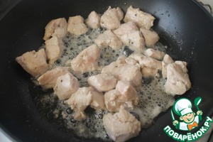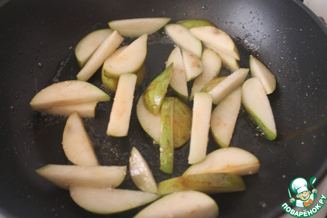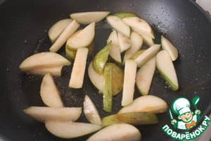 Выложить куриное филе в миску, в сковороду положить груши и тоже обжарить, помешивая, около 3 минут.