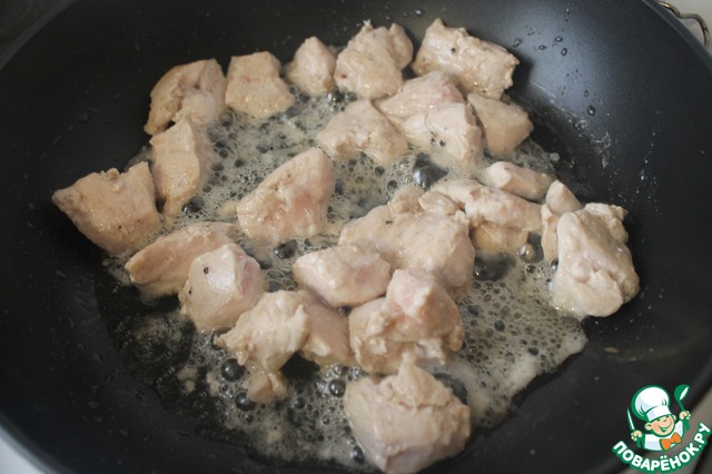 Куриное филе произвольно нарезать, сбрызнуть 0,5 ст. л. соевого соуса, слегка посолить и обжарить на растительном масле до готовности.