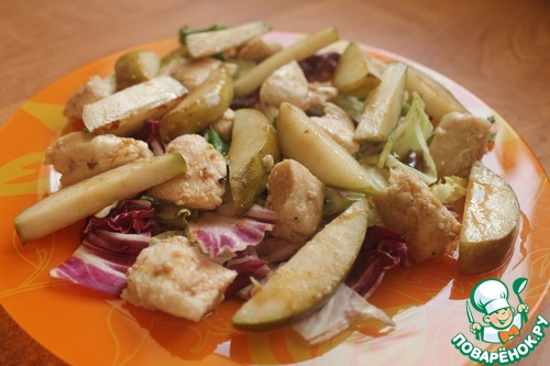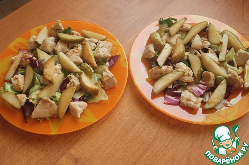На блюдо выложить салатный микс, курицу с грушами и полить заправкой. Угощайтесь!