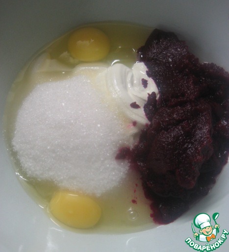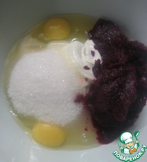 В миске соединить яйца, сметану, сахар, размягченное сливочное масло и свекольное пюре, клюкву.