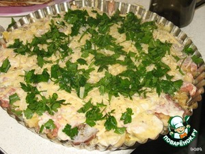 Затем всё посыпать рубленной зеленью и запекать в духовке при температуре 180 С около 25-30 минут.
