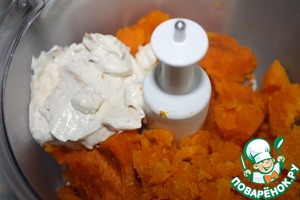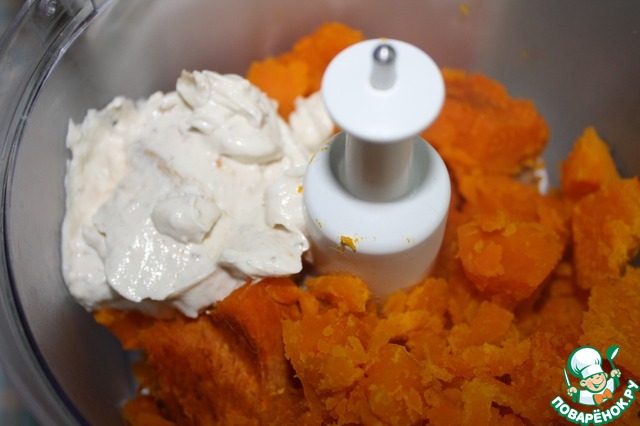 • Готовую тыкву очистить от шкурки и сложить в блендер. Туда же добавить йогурт со специями.
