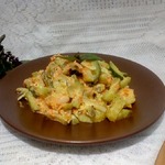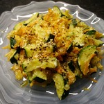 Цуккини сбрызнуть соком лимона, перемешать, не солить (иначе они выделят сок) и переложить в миску.