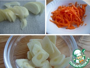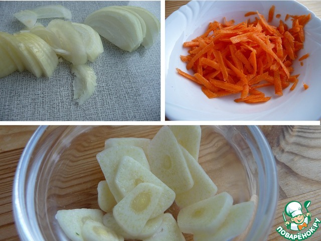 Лук нарезать полукольцами, морковь натереть на крупной терке, чеснок нарезать пластинами.