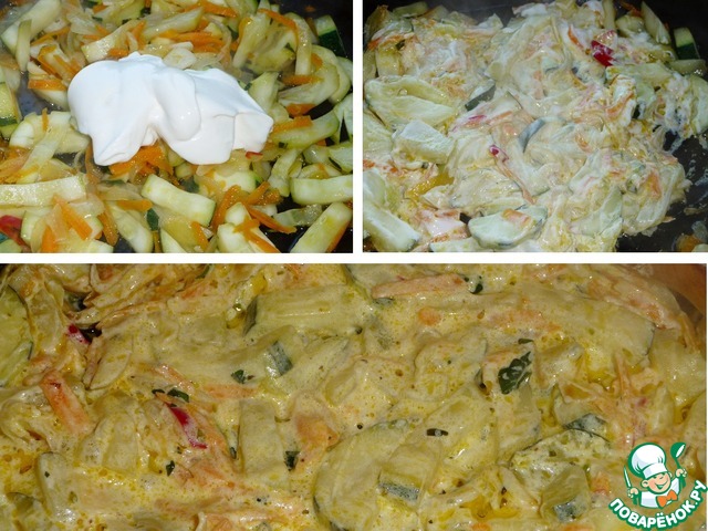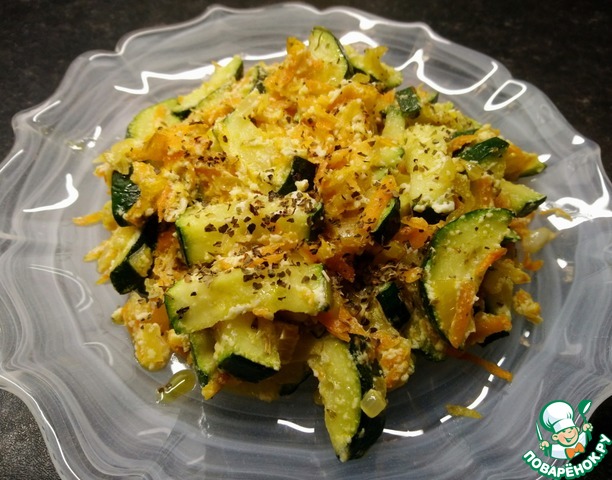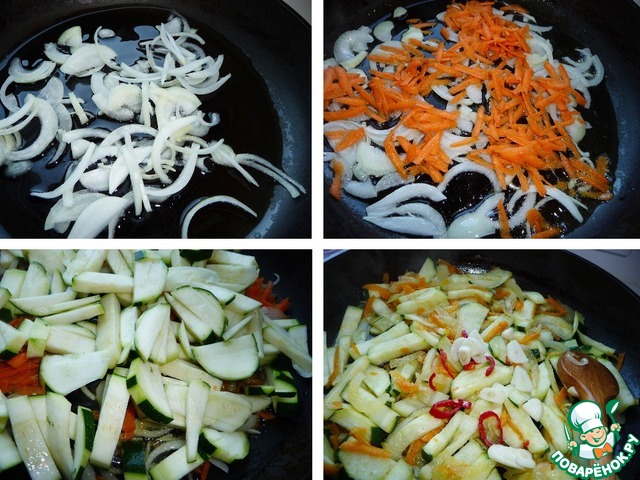 В сковороде разогреть масло, выложить в него лук, слегка обжарить, добавить морковь, жарим минуты 2-3, перемешивая. Добавить цуккини и жарить 5 мин. до мягкого состояния, перемешивая.
