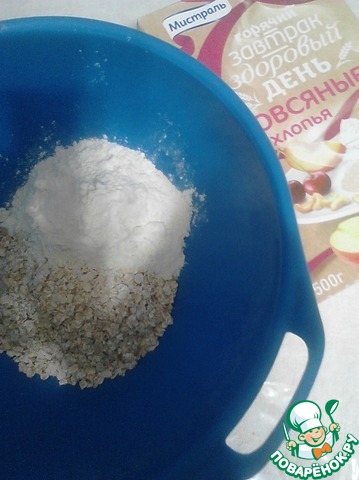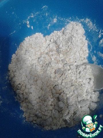 В большой миске смешать овсяные хлопья, муку, сахар, соль, отруби.