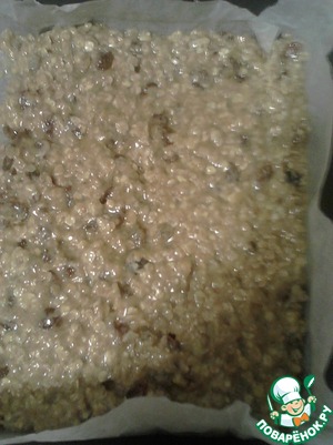 Добавить жижкие ингредиенты к сухим и перемешать. Форму для выпечки размером 20 на 20 см выложить бумагой для выпечки, смазать растительным маслом. Выложить полученную массу в форму, хорошо утромбовать.