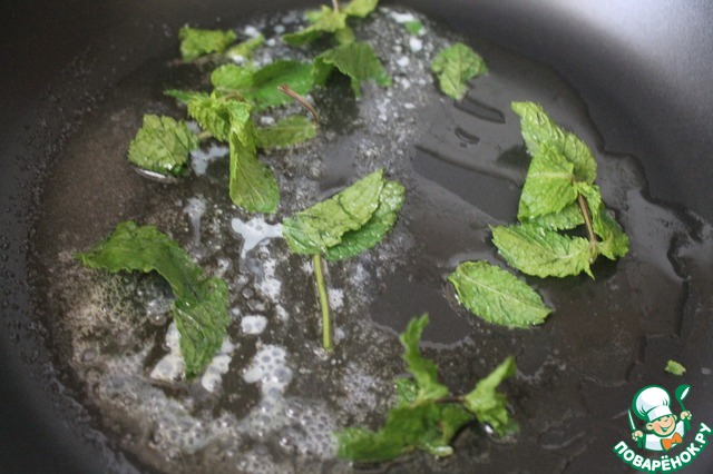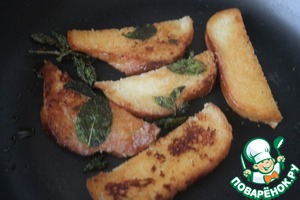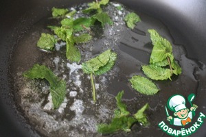 Для тостов разогреем сковороду с оставшимся сливочным маслом. Положим несколько листьев мяты и прогреем на медленном огне несколько минут, помешивая.