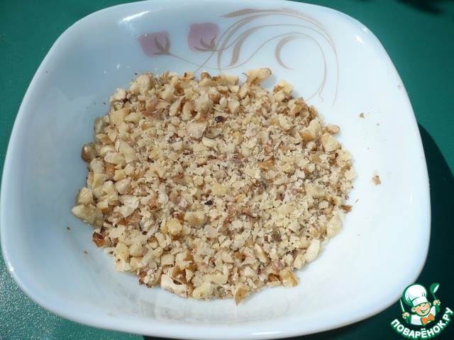 Затем, добавляем измельченные грецкие орехи. И опять хорошо перемешиваем.