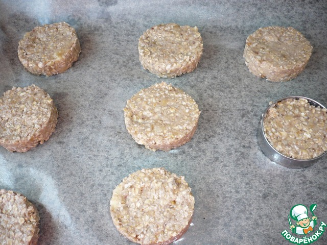 Противень застилаем бумагой для запекания, слегка смазываем растительным маслом и столовой ложкой выкладываем овсяное печенье на не большем расстоянии (я использовала металлическую вырубку для печенья). У меня получилось 10 штук овсяного печенья. Печенье украсила половинками грецкого ореха и овсяными хлопьями.